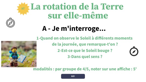 1-Quand on observe le Soleil à différents moments de la journée, que remarque-t'on ? 2-Est-ce que le Soleil bouge ? 3-Dans quel sens ? modalités : par groupe de 4/5, noter sur une affiche : 5'