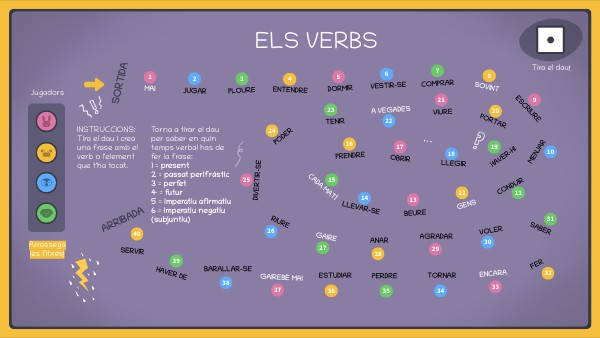 Torna a tirar el dau per saber en quin temps verbal has de fer la frase: 1 = present 2 = passat perifràstic 3 = perfet 4 = futur 5 = imperatiu afirmatiu 6 = imperatiu negatiu (subjuntiu)