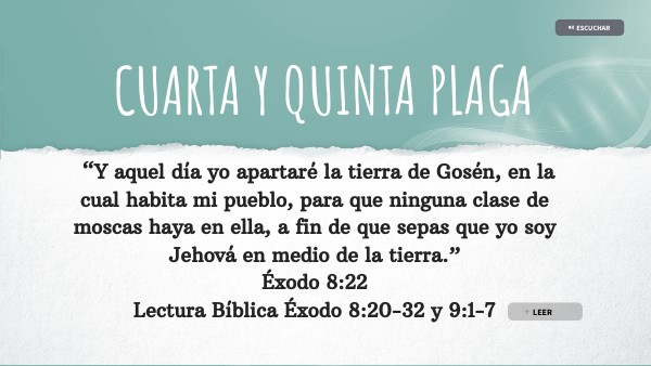 “Y aquel día yo apartaré la tierra de Gosén, en la cual habita mi pueblo, para que ninguna clase de moscas haya en ella, a fin de que sepas que yo soy Jehová en medio de la tierra.”Éxodo 8:22 Lectura Bíblica Éxodo 8:20-32 y 9:1-7