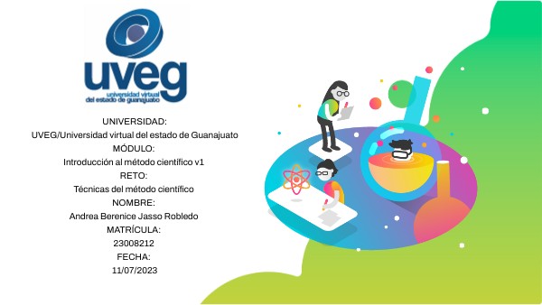 UNIVERSIDAD: UVEG/Universidad virtual del estado de Guanajuato MÓDULO: Introducción al método científico v1 RETO: Técnicas del método científico NOMBRE: Andrea Berenice Jasso Robledo MATRÍCULA: 23008212 FECHA: 11/07/2023