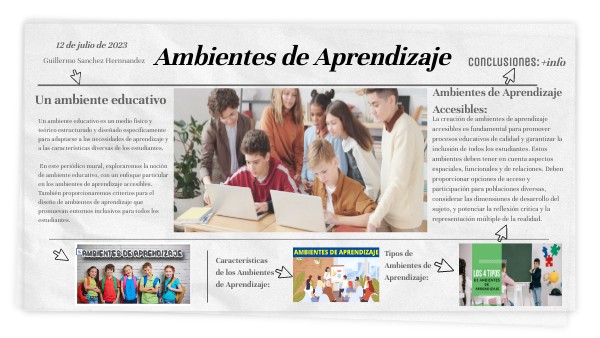 Un ambiente educativo es un medio físico y teórico estructurado y diseñado específicamente para adaptarse a las necesidades de aprendizaje y a las características diversas de los estudiantes. En este periódico mural, exploraremos la noción de ambiente educativo, con un enfoque particular en los ambientes de aprendizaje accesibles. También proporcionaremos criterios para el diseño de ambientes de aprendizaje que promuevan entornos inclusivos para todos los estudiantes.