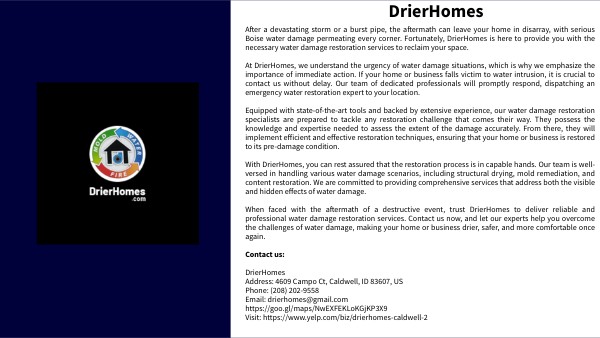 When faced with the aftermath of a destructive event, trust DrierHomes to deliver reliable and professional water damage restoration services. Contact us now, and let our experts help you overcome the challenges of water damage, making your home or business drier, safer, and more comfortable once again.