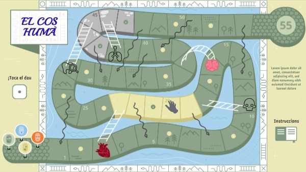 INSTRUCCIONES Els jugadors són les fitxetes de colors que veus al cantó del tauler. Heu de tocar el dau i moure les fitxes. Si caieu en una casella que té el dibuix d'algun òrgan del cos humà, pareu atenció perquè haureu de respondre alguna pregunta, ja sigui llegint o escoltant. Si encerteu la pregunta podeu continuar pujant l'escala; si no l'encerteu, no pugeu l'escala i perdeu un torn. Passa per damunt de les serps, si veus una maneta, hauràs de parar atenció. Guanya el que arriba primer al final: casella 55.
