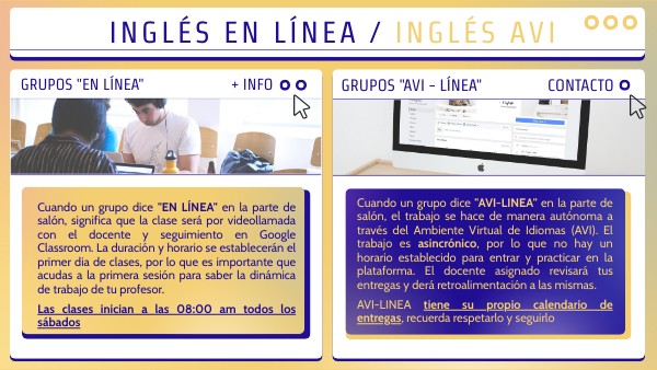 Cuando un grupo dice "EN LÍNEA" en la parte de salón, significa que la clase será por videollamada con el docente y seguimiento en Google Classroom. La duración y horario se establecerán el primer dia de clases, por lo que es importante que acudas a la primera sesión para saber la dinámica de trabajo de tu profesor. Las clases inician a las 08:00 am todos los sábados