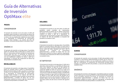 El horizonte de inversión es de largo plazo. El 100% de la alternativa está invertida en un portafolio de Allianz que tiene como objetivo, al cabo de un año, generar un rendimiento similar al del índice S&P500. Se tiene una protección (Buffer) de 20% en caso de una caída en el índice de referencia una vez que termine el periodo; en caso de que el índice de referencia tenga un rendimiento positivo se tendrá un tope (CAP) de rendimiento el cual se definirá un día antes del inicio del periodo de la alternativa (al inicio de cada trimestre). El Buffer y el CAP tendrán efecto una vez que termine el periodo de la alternativa (último día del mismo trimestre del siguiente año).