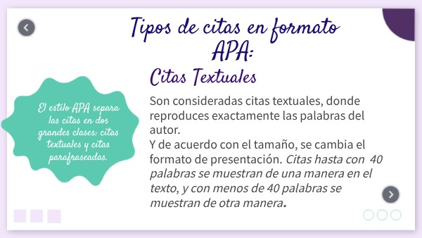Son consideradas citas textuales, donde reproduces exactamente las palabras del autor. Y de acuerdo con el tamaño, se cambia el formato de presentación. Citas hasta con 40 palabras se muestran de una manera en el texto, y con menos de 40 palabras se muestran de otra manera.