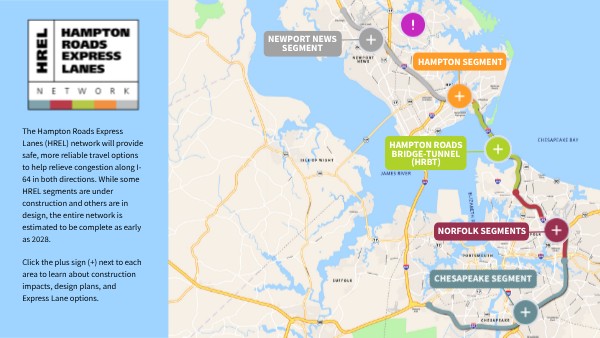 The Hampton Roads Express Lanes (HREL) network will provide safe, more reliable travel options to help relieve congestion along I-64 in both directions. While some HREL segments are under construction and others are in design, the entire network is estimated to be complete as early as 2028. Click the plus sign (+) next to each area to learn about construction impacts, design plans, and Express Lane options.