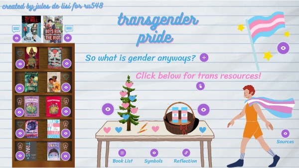Next to the display is a station with a tree and cut out hearts in the colors of the trans flag that have been hole punched and have a string attached. On these hearts patrons can write messages of encouragement for trans kids and teens. The messages would be screened by a librarian before being put onto the tree. There will also be a bookmark basket next to the tree with bookmark specifically for trans teens as well as allies.