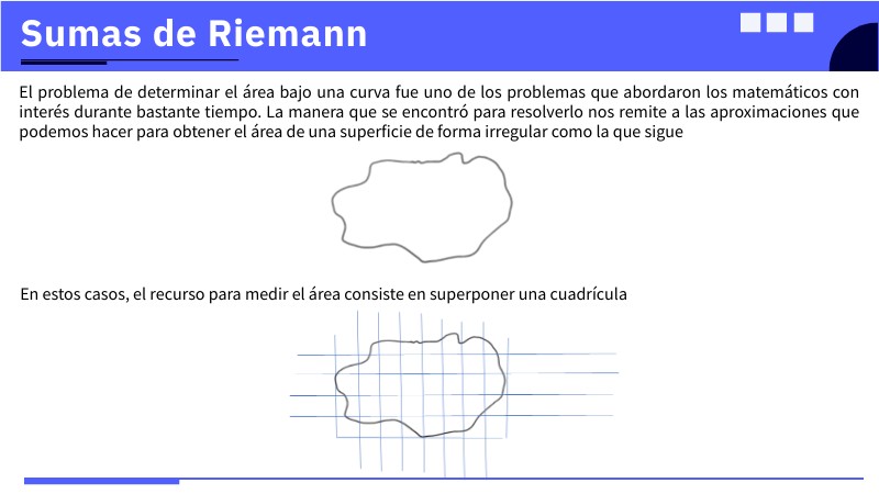 El problema de determinar el área bajo una curva fue uno de los problemas que abordaron los matemáticos con interés durante bastante tiempo. La manera que se encontró para resolverlo nos remite a las aproximaciones que podemos hacer para obtener el área de una superficie de forma irregular como la que sigue