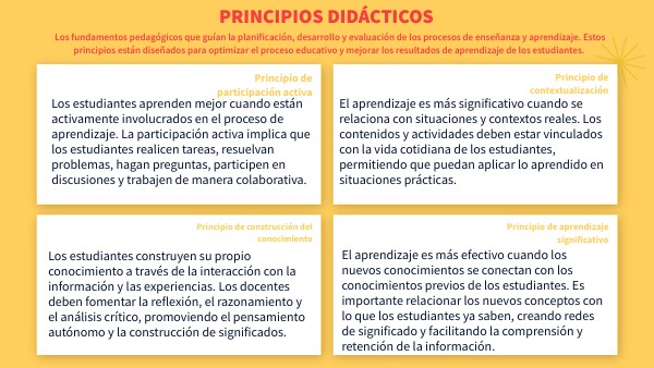 Los fundamentos pedagógicos que guían la planificación, desarrollo y evaluación de los procesos de enseñanza y aprendizaje. Estos principios están diseñados para optimizar el proceso educativo y mejorar los resultados de aprendizaje de los estudiantes.