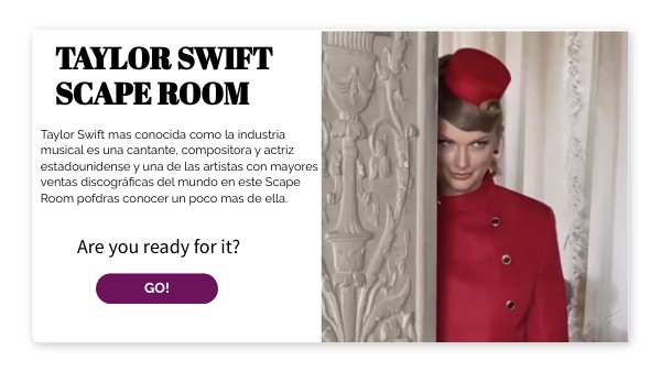 Taylor Swift mas conocida como la industria musical es una cantante, compositora y actriz estadounidense y una de las artistas con mayores ventas discográficas del mundo en este Scape Room pofdras conocer un poco mas de ella.