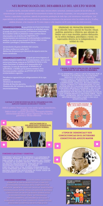 DESARROLLO FISICO: Es un proceso en el que intervienen factores como la información genética, la actividad motriz, el estado de salud, la nutrición y el bienestar emocional.En la adultez tardía se presentan varios cambios físicos relacionados con el declive del organismo, no necesariamente son sinónimo de enfermedades o problemas médicos, lo cierto es que durante la tercera edad es mas sensible a patologías y alteraciones físicas. -Acumulación de grasa alrededor del corazón. -El ritmo cardiaco se vuelve lento. -Reducción de estatura por deterioro de espacio entre los discos vertebrales. DESARROLLO COGNITIVO: Al igual que otros órganos, el cerebro humano cambia con el envejecimiento, tanto en sus estructuras físicas, como en su habilidad de llevar a cabo varias funciones, el cerebro es el responsable de la cognición, la toma de decisiones, la sabiduría y el aprendizaje, a medida que la persona envejece, estas funciones pueden cambiar, un proceso que se llama envejecimiento cognitivo. Decadencia cognoscitiva por adelgazamiento de la capa mielínica. -Deterioro de memoria. -Perdida de función ejecutiva. -Disminución del volumen y densidad de neurotransmisores.