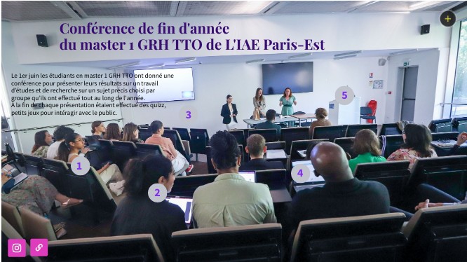 Le 1er juin les étudiants en master 1 GRH TTO ont donné une conférence pour présenter leurs résultats sur un travail d’études et de recherche sur un sujet précis choisi par groupe qu’ils ont effectué tout au long de l'année. À la fin de chaque présentation étaient effectué des quizz, petits jeux pour intéragir avec le public.