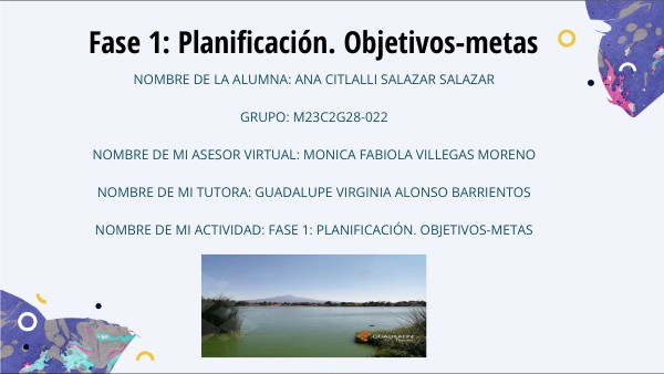NOMBRE DE LA ALUMNA: ANA CITLALLI SALAZAR SALAZAR GRUPO: M23C2G28-022 NOMBRE DE MI ASESOR VIRTUAL: Monica Fabiola Villegas Moreno NOMBRE DE MI TUTORA: Guadalupe Virginia Alonso Barrientos NOMBRE DE MI ACTIVIDAD: Fase 1: Planificación. Objetivos-metas