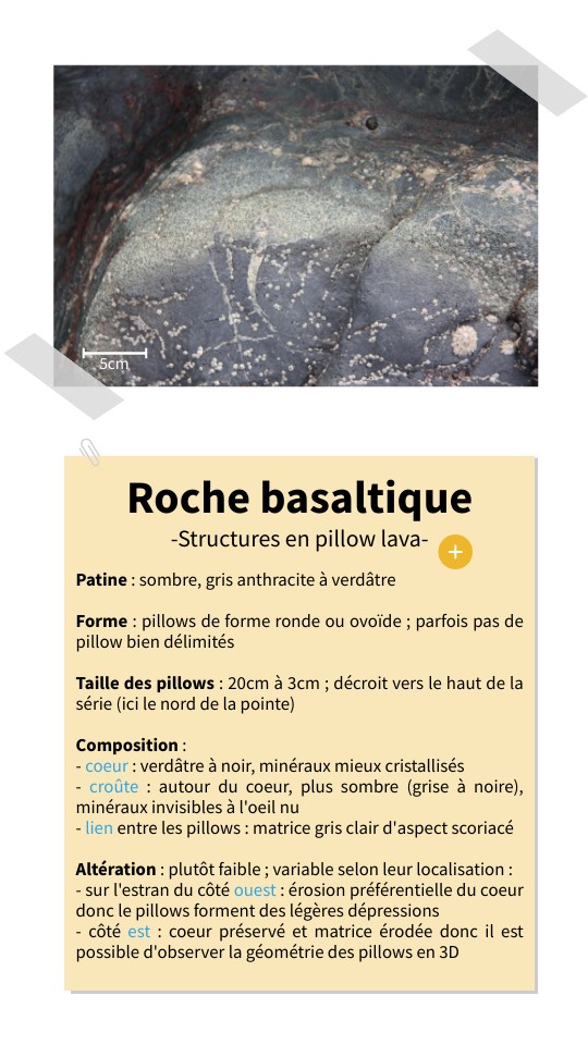 Patine : sombre, gris anthracite à verdâtre Forme : pillows de forme ronde ou ovoïde ; parfois pas de pillow bien délimités Taille des pillows : 20cm à 3cm ; décroit vers le haut de la série (ici le nord de la pointe) Composition : - coeur : verdâtre à noir, minéraux mieux cristallisés - croûte : autour du coeur, plus sombre (grise à noire), minéraux invisibles à l'oeil nu - lien entre les pillows : matrice gris clair d'aspect scoriacé Altération : plutôt faible ; variable selon leur localisation : - sur l'estran du côté ouest : érosion préférentielle du coeur donc le pillows forment des légères dépressions - côté est : coeur préservé et matrice érodée donc il est possible d'observer la géométrie des pillows en 3D