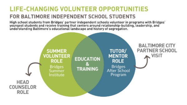 Independent school volunteers commit to two weeks of service with Bridges' 4th through 9th grade students in the Summer Institute. Volunteers support one grade of students, serving as teacher's assistants during class time and helping to keep the group on schedule throughout the day. They build meaningful relationships with students and help to create an enthusiastic atmosphere on campus. Summer volunteers gain an understanding of barriers associated with summer opportunities for Baltimore City students, and build meaningful connections and lasting memories with their class of Bridges students.