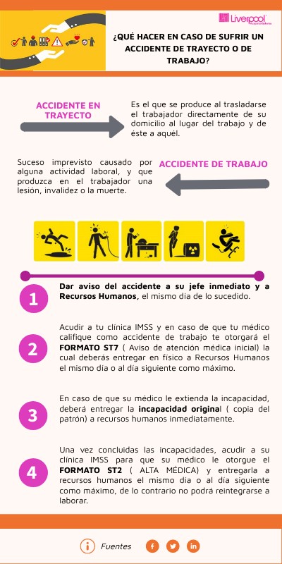 Dar aviso del accidente a su jefe inmediato y a Recursos Humanos, el mismo día de lo sucedido. Acudir a tu clínica IMSS y en caso de que tu médico califique como accidente de trabajo te otorgará el FORMATO ST7 ( Aviso de atención médica inicial) la cual deberás entregar en físico a Recursos Humanos el mismo día o al día siguiente como máximo. En caso de que su médico le extienda la incapacidad, deberá entregar la incapacidad original ( copia del patrón) a recursos humanos inmediatamente. Una vez concluidas las incapacidades, acudir a su clínica IMSS para que su médico le otorgue el FORMATO ST2 ( ALTA MÉDICA) y entregarla a recursos humanos el mismo día o al día siguiente como máximo, de lo contrario no podrá reintegrarse a laborar.