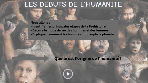 Nous allons : - Identifier les principales étapes de la Préhistoire - Décrire le mode de vie des hommes et des femmes - Expliquer comment les hommes ont peuplé la planète