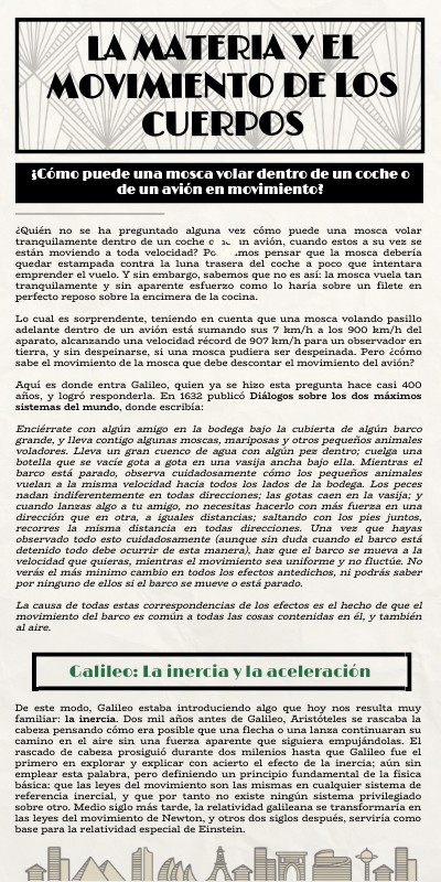 ¿Quién no se ha preguntado alguna vez cómo puede una mosca volar tranquilamente dentro de un coche o de un avión, cuando estos a su vez se están moviendo a toda velocidad? Podríamos pensar que la mosca debería quedar estampada contra la luna trasera del coche a poco que intentara emprender el vuelo. Y sin embargo, sabemos que no es así: la mosca vuela tan tranquilamente y sin aparente esfuerzo como lo haría sobre un filete en perfecto reposo sobre la encimera de la cocina. Lo cual es sorprendente, teniendo en cuenta que una mosca volando pasillo adelante dentro de un avión está sumando sus 7 km/h a los 900 km/h del aparato, alcanzando una velocidad récord de 907 km/h para un observador en tierra, y sin despeinarse, si una mosca pudiera ser despeinada. Pero ¿cómo sabe el movimiento de la mosca que debe descontar el movimiento del avión? Aquí es donde entra Galileo, quien ya se hizo esta pregunta hace casi 400 años, y logró responderla. En 1632 publicó Diálogos sobre los dos máximos sistemas del mundo, donde escribía: Enciérrate con algún amigo en la bodega bajo la cubierta de algún barco grande, y lleva contigo algunas moscas, mariposas y otros pequeños animales voladores. Lleva un gran cuenco de agua con algún pez dentro; cuelga una botella que se vacíe gota a gota en una vasija ancha bajo ella. Mientras el barco está parado, observa cuidadosamente cómo los pequeños animales vuelan a la misma velocidad hacia todos los lados de la bodega. Los peces nadan indiferentemente en todas direcciones; las gotas caen en la vasija; y cuando lanzas algo a tu amigo, no necesitas hacerlo con más fuerza en una dirección que en otra, a iguales distancias; saltando con los pies juntos, recorres la misma distancia en todas direcciones. Una vez que hayas observado todo esto cuidadosamente (aunque sin duda cuando el barco está detenido todo debe ocurrir de esta manera), haz que el barco se mueva a la velocidad que quieras, mientras el movimiento sea uniforme y no fluctúe. No verás el más minimo cambio en todos los efectos antedichos, ni podrás saber por ninguno de ellos si el barco se mueve o está parado. La causa de todas estas correspondencias de los efectos es el hecho de que el movimiento del barco es común a todas las cosas contenidas en él, y también al aire.