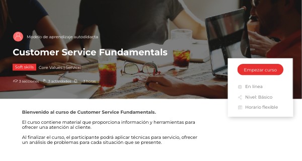 Bienvenido al curso de Customer Service Fundamentals. El curso contiene material que proporciona información y herramientas para ofrecer una atención al cliente. Al finalizar el curso, el participante podrá aplicar técnicas para servicio, ofrecer un análisis de problemas para cada situación que se presente.