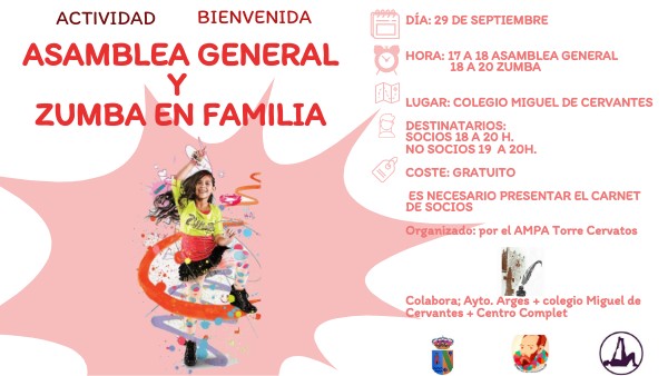 DÍA: 29 DE SEPTIEMBRE HORA: 17 A 18 ASAMBLEA GENERAL18 A 20 ZUMBA LUGAR: COLEGIO MIGUEL DE CERVANTES DESTINATARIOS: SOCIOS 18 A 20 H. NO SOCIOS 19 A 20H. COSTE: GRATUITO ES NECESARIO PRESENTAR EL CARNET DE SOCIOS Organizado: por el AMPA Torre Cervatos Colabora; Ayto. Arges + colegio Miguel de Cervantes + Centro Complet