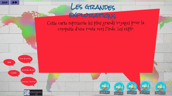 Cette carte représente les plus grands voyages pour la conquête d'une route vers l'Inde. Les explorateurs n'ont pas tous réussi à trouver le passage pour s'y rendre. Cependant, ils ont découvert de Nouveaux Mondes à conquérir. Clique sur les pays de départ pour faire apparaitre les trajets et place ensuite les explorateurs et le territoire qu'ils ont découvert aux bons endroits. Un court texte accompagne les explorateurs pour t'aider à les placer.