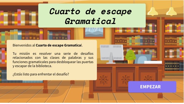 Bienvenidos al Cuarto de escape Gramatical. Tu misión es resolver una serie de desafíos relacionados con las clases de palabras y sus funciones gramaticales para desbloquear las puertas y escapar de la biblioteca. ¿Estás listo para enfrentar el desafío?