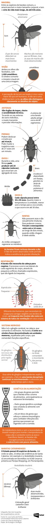 Não é só o gânglio cerebral, na cabeça, que comanda os estímulos. Na barata, é como se o cérebro fosse descentralizado em unidades menores, espalhadas pelo corpo, que comandam funções específicas.