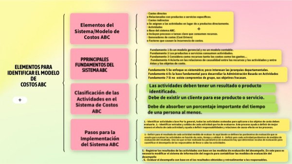 • Costos directos o Relacionados con productos o servicios específicos. • Costos indirectos o Se asignan a las actividades en lugar de a productos directamente. • Actividades o Base del sistema ABC. o Incluyen procesos o tareas clave que consumen recursos. • Generadores de costos (Cost Drivers) o Factores que causan la incurrencia de costos.
