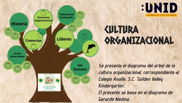 Se presenta el diagrama del árbol de la cultura organizacional, correspondiente al Colegio Anaife, S.C. "Golden Valley Kindergarten".El presente se basa en el diagrama de Gerardo Medina.