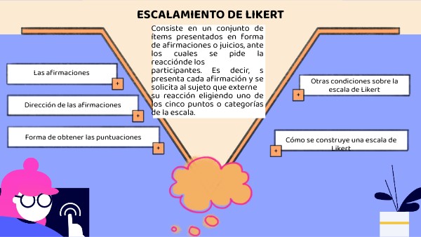 Consiste en un conjunto de ítems presentados en forma de afirmaciones o juicios, ante los cuales se pide la reacciónde los participantes. Es decir, s presenta cada afirmación y se solicita al sujeto que externe su reacción eligiendo uno de los cinco puntos o categorías de la escala.