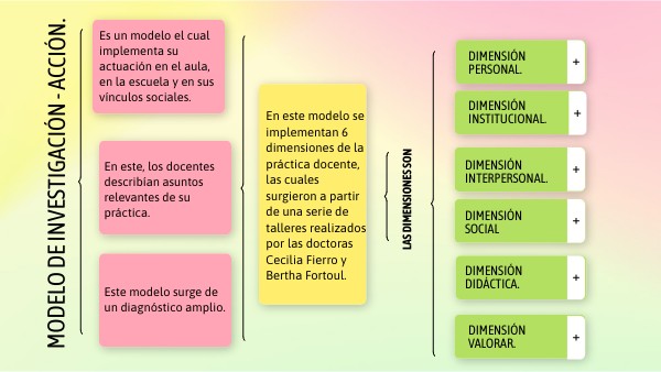 En este modelo se implementan 6 dimensiones de la práctica docente, las cuales surgieron a partir de una serie de talleres realizados por las doctoras Cecilia Fierro y Bertha Fortoul.
