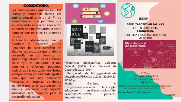 Referencias bibliográficas Gobierno Federal. (2019). Plan Nacional de Desarrollo 2019- 2024. Recuperado de http://gaceta.diputa dos.gob.mx/PDF/64/2 019/abr/20190430- XVIII-1.pdf Acuña Gamboa. A. ttps://www.educacionfu tura.org/la-educacion- en-el-plan-nacional-de- desarrollo-2019-2024- primeras-impresiones/