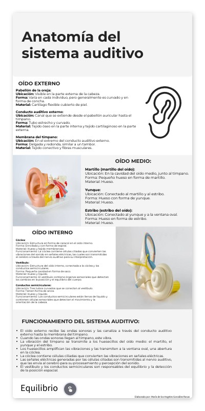 Cóclea:Ubicación: Estructura en forma de caracol en el oído interno. Forma: Enrollada y con forma de espiral. Material: Hueso y tejido membranoso. Funcionamiento: La cóclea contiene células ciliadas que convierten las vibraciones del sonido en señales eléctricas, las cuales son transmitidas al cerebro a través del nervio auditivo para su interpretación. Vestíbulo: Ubicación: Estructura del oído interno, conectada a la cóclea y los conductos semicirculares. Forma: Pequeña cavidad en forma de saco. Material: Hueso y líquido. Funcionamiento: El vestíbulo contiene órganos sensoriales que detectan los cambios en la posición y el equilibrio del cuerpo. Conductos semicirculares: Ubicación: Tres tubos curvados que se conectan al vestíbulo. Forma: Tienen forma de arcos. Material: Hueso y líquido. Funcionamiento: Los conductos semicirculares están llenos de líquido y contienen células sensoriales que detectan el movimiento y la orientación de la cabeza.