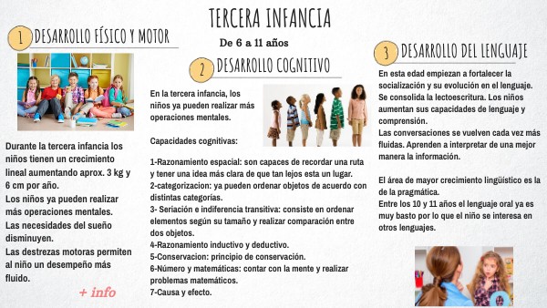 Durante la tercera infancia los niños tienen un crecimiento lineal aumentando aprox. 3 kg y 6 cm por año. Los niños ya pueden realizar más operaciones mentales. Las necesidades del sueño disminuyen. Las destrezas motoras permiten al niño un desempeño más fluido.
