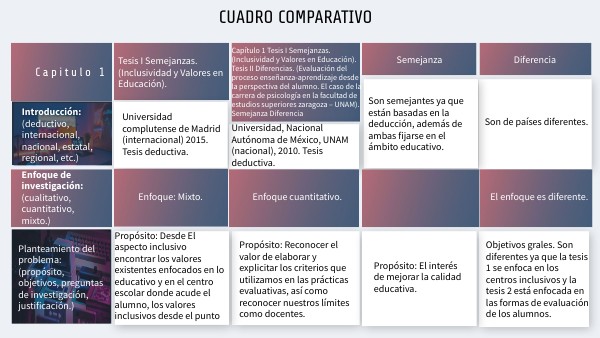 Capítulo 1 Tesis I Semejanzas. (Inclusividad y Valores en Educación). Tesis II Diferencias. (Evaluación del proceso enseñanza-aprendizaje desde la perspectiva del alumno. El caso de la carrera de psicología en la facultad de estudios superiores zaragoza – UNAM). Semejanza Diferencia