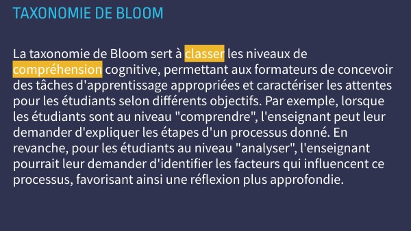 La taxonomie de Bloom sert à classer les niveaux de compréhension cognitive, permettant aux formateurs de concevoir des tâches d'apprentissage appropriées et caractériser les attentes pour les étudiants selon différents objectifs. Par exemple, lorsque les étudiants sont au niveau "comprendre", l'enseignant peut leur demander d'expliquer les étapes d'un processus donné. En revanche, pour les étudiants au niveau "analyser", l'enseignant pourrait leur demander d'identifier les facteurs qui influencent ce processus, favorisant ainsi une réflexion plus approfondie.