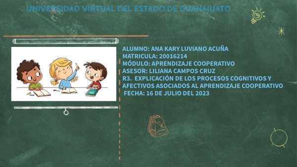 ALUMNO: ANA KARY LUVIANO ACUÑA MATRICULA: 20016214 MÓDULO: APRENDIZAJE COOPERATIVO ASESOR: LILIANA CAMPOS CRUZ R3. Explicación de los procesos cognitivos y afectivos asociados al aprendizaje cooperativo FECHA: 16 DE JULIO DEL 2023
