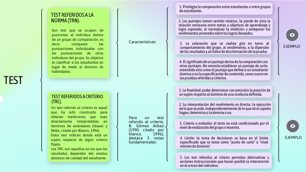 Un test referido al criterio es aquel que ha sido construido para obtener mediciones que sean directamente interpretables en términos de estándares (Glaser y Nitko, citado por Blanco, 1996). Estos test indican donde está un sujeto respecto de algún criterio fijado. Los TRC son aquellos en los que los resultados dependen del estatus absoluto de calidad del estudiante.