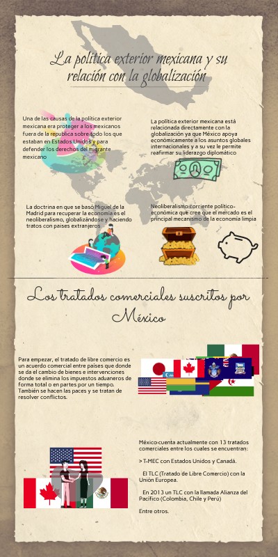 La política exterior mexicana está relacionada directamente con la globalización ya que México apoya económicamente a los asuntos globales internacionales y a su vez le permite reafirmar su liderazgo diplomático