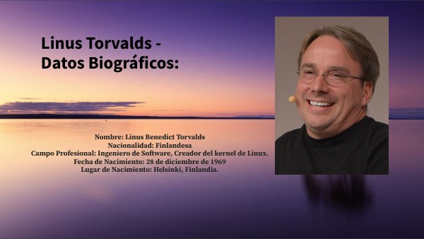 Nombre: Linus Benedict Torvalds Nacionalidad: Finlandesa Campo Profesional: Ingeniero de Software, Creador del kernel de Linux. Fecha de Nacimiento: 28 de diciembre de 1969 Lugar de Nacimiento: Helsinki, Finlandia.
