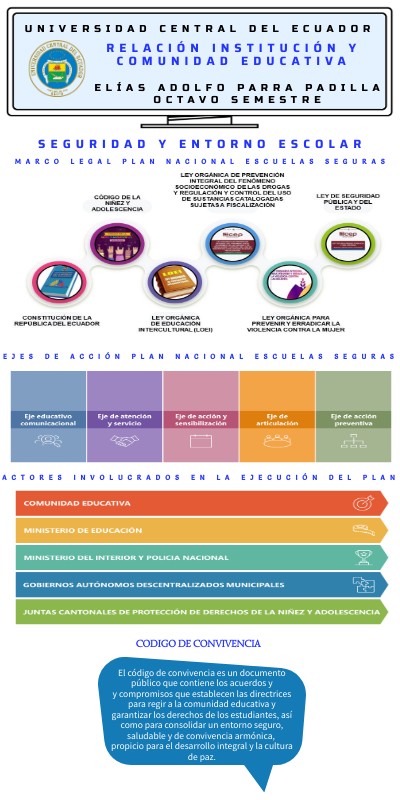 UCE, (2023). Plan Nacional Escuelas Seguras. Recuperado de https://uvirtualenlinea.uce.edu.ec/pluginfile.php/47193/mod_resource/content/3/Plan-Nacional-Escuelas-Seguras.pdf UCE, (2023). Construcción del Código de convivencia. Recuperado de https://uvirtualenlinea.uce.edu.ec/pluginfile.php/47194/mod_resource/content/1/4-Colmena-Codigo-de-Convivencia.pdf.