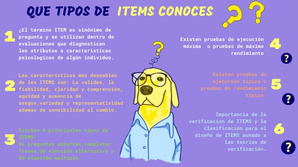 Existen 4 principales tipos de ITEMS:De preguntas abiertas,completar frases,de elección alternativa y de elección multiple.