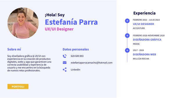 Soy diseñadora gráfica & UX/UI con experiencia en la creación de productos digitales, webs y app que garanticen una correcta usabilidad y experiencia de usuario y me encuentro en la búsqueda de nuevos retos profesionales.