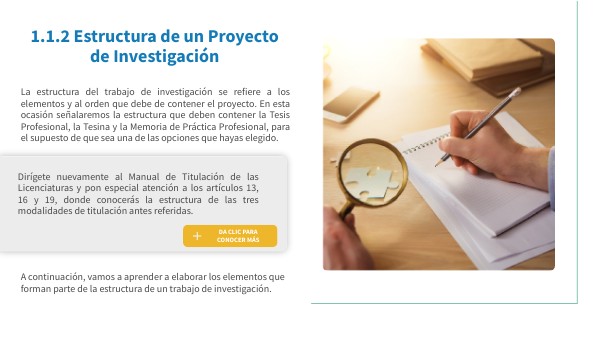 Dirígete nuevamente al Manual de Titulación de las Licenciaturas y pon especial atención a los artículos 13, 16 y 19, donde conocerás la estructura de las tres modalidades de titulación antes referidas.