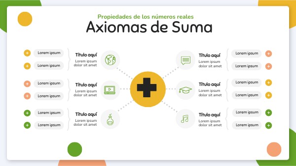Estos axiomas establecen reglas que se aplican a los números naturales (1, 2, 3, ...), y a partir de ellos, se pueden construir otras propiedades más avanzadas de la suma en conjuntos numéricos más amplios, como los números enteros, racionales o reales.