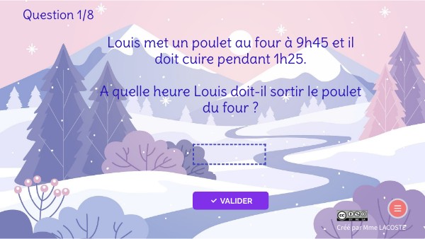 Louis met un poulet au four à 9h45 et il doit cuire pendant 1h25. A quelle heure Louis doit-il sortir le poulet du four ?