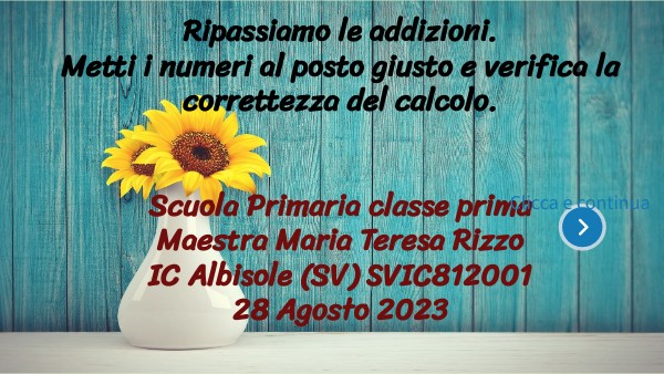 Ripassiamo le addizioni. Metti i numeri al posto giusto e verifica la correttezza del calcolo. Scuola Primaria classe prima Maestra Maria Teresa Rizzo IC Albisole (SV) SVIC812001 28 Agosto 2023