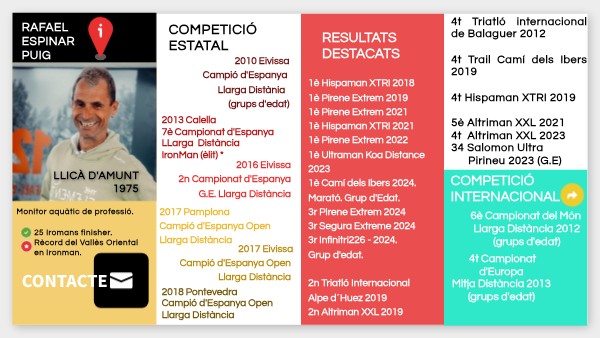 Monitor aquàtic de professió. 25 Iromans finisher. Rècord del Vallès Oriental en Ironman.