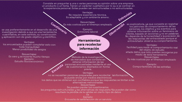 Ventajas:No requiere experiencia técnica. Es adaptable y con ambiente ameno. Desventajas: Es más costosa por el timempo empleado Ejemplo: Entrevista laboral